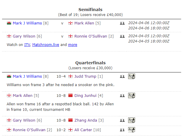 1/4决赛的对阵为:特鲁姆普VS威廉姆斯、奥沙利文VS卡特、丁俊晖VS艾伦、张安达VS威尔逊。第一个晋级4强的是单赛季天下排行第二的奥沙利文,他以10-2横扫“机长”卡特。