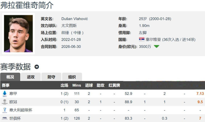尤文图斯本年夏窗渴慕卖掉高薪球员(税后年薪1200万欧元)、25岁塞尔维亚中锋弗拉霍维奇,但由于薪水太高,无球队接盘,球员也不乐意肃清高薪,贪图来岁夏窗目田身离队,这么不错拿到高额署名费和大左券。弗拉霍维奇在如斯配景之下迎来了大爆发,成为尤文图斯的锋霸,算是真拿钱做事了。弗拉霍维奇本赛季于今各项赛事共为尤文图斯出场7次,但5次是替补出场体育赛事直播,总共出场269分钟,孝顺6球1助,这抑止惊东谈主呀!若弗拉霍维奇保握如斯高效的输出,他会成为尤文图斯的“心头肉”。